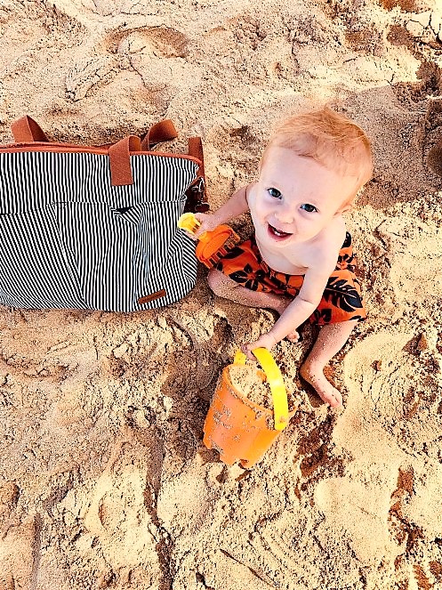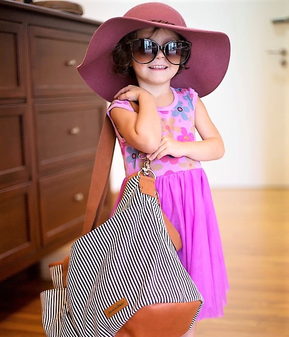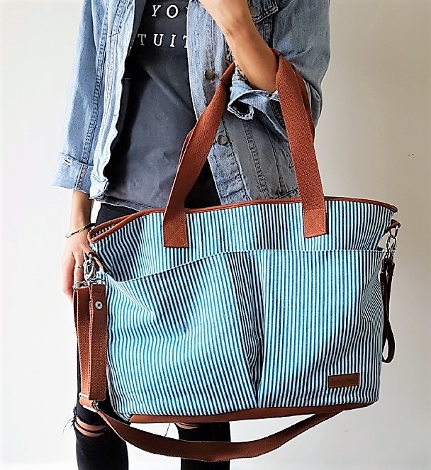 Fashionable vertical striped Tiki diaper bag can be worn over the shoulder, or across your body and is the ideal size to function as your diaper bag or as your everyday tote sling bag.