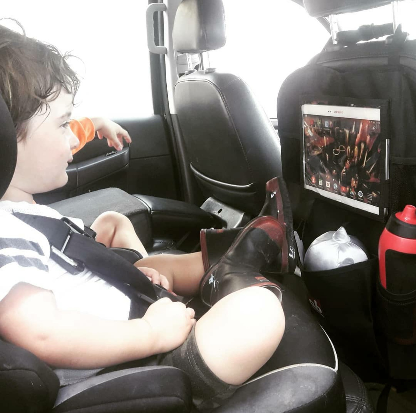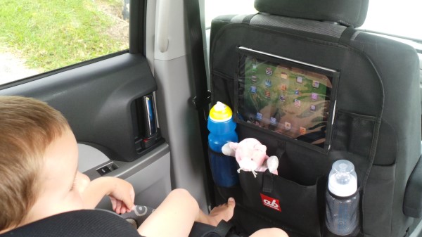 - One large polyester pocket for bulkier items (small toys, toiletries, snacks etc) with Velcro strap to hold things in place